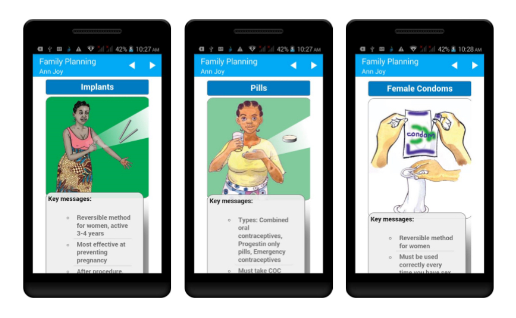 Community-based family planning system, with multiple implementations, which supports community health workers and supervisors who provide family planning services in the community. This system follows the Balanced Counseling Strategy Plus and Tanzania guidelines.