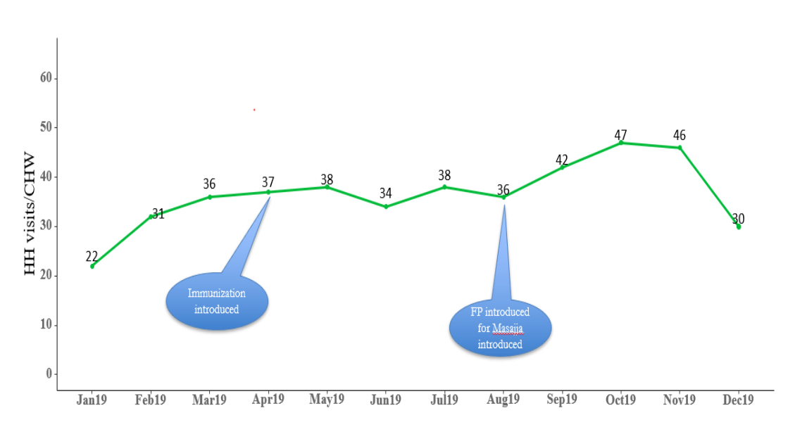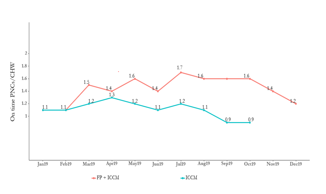 Introduction of family planning into the service basket led to overall improvement in CHW performance. CHWs providing a combination of family planning, immunization, and Integrated Community Case Management (ICCM) services visited 10 additional unique households and treated seven more sick children compared to when they delivered only ICCM and immunization services(Figure 1).The average number of unique households visited by CHWs when FP was introduced grew from 36 to 46 per CHW from August to November 2019. In addition, they treated 17 sick children every month as opposed to 10 sick children when implementing ICCM and immunization modules. CHWs actively providing FP services also conducted more postnatal care visits than their counterparts (Figure 2).
