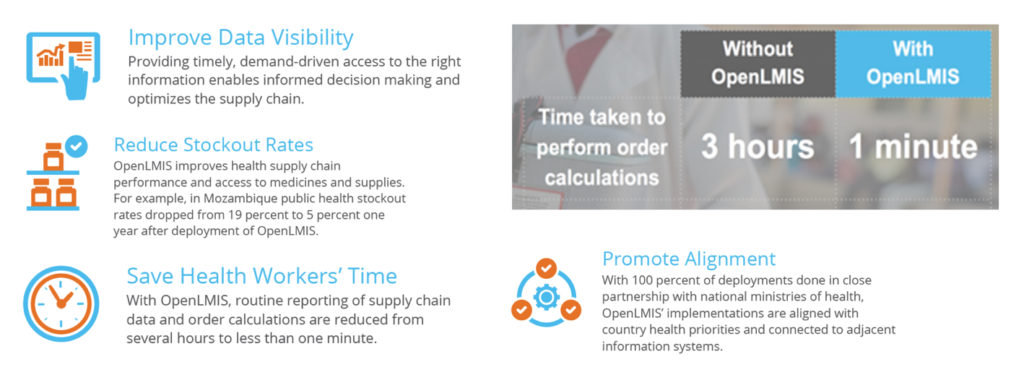 Governments need accurate, timely logistics data from their health facilities to make decisions about procurement and supply of medical commodities; however, too often this information is inaccurate or simply not available. As a result, health systems in many countries continue to experience stockouts of essential medicines, leaving people vulnerable to treatable illness and diseases. OpenLMIS is a state-of-the-art, open-source electronic Logistics Management Information System (LMIS) solution, which automates logistics processes and promotes visibility, timeliness, and accuracy of supply chain data. This data is essential to reducing stockouts, managing waste and losses, and operating an effective supply chain.